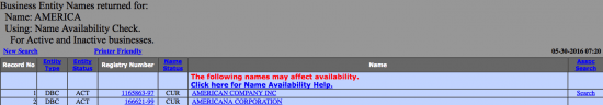 Step 2- If the entered name is available, you will see results similar to the first photo shown below. However, if the name is currently is use by another entity, you will receive a notice displaying the other business names that may be in conflict with the your desired entity name.