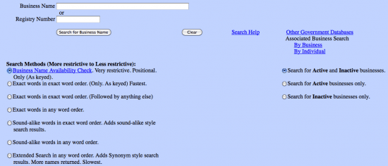 Step 1- You may research the details of an entity by first accessing this website. Choose a search method from the options found on the left to narrow down your results. On the right hand side of the page you may specify whether you would like to search for active businesses, inactive, or both. Continue by submitting an entity name into the search bar.