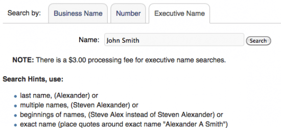 Step 2- A $3.00 fee must be included in order to complete a search by executive name. Use one of the available payment options to supply this fee.