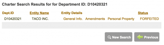 Step 2- You will be presented with a list of entities based on your search criteria (displayed below). For any given entity you can select general info, amendments, or personal property to be transported to that entity’s individual page within the DAT website.