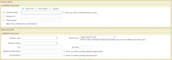 Step 1- To search by name, navigate to this webpage to enter the name in question into the first search field. You may choose between Starts With, Exact Match and Contains. You will also be able to request that the results also show businesses with similar sounding names. Click Search when ready.