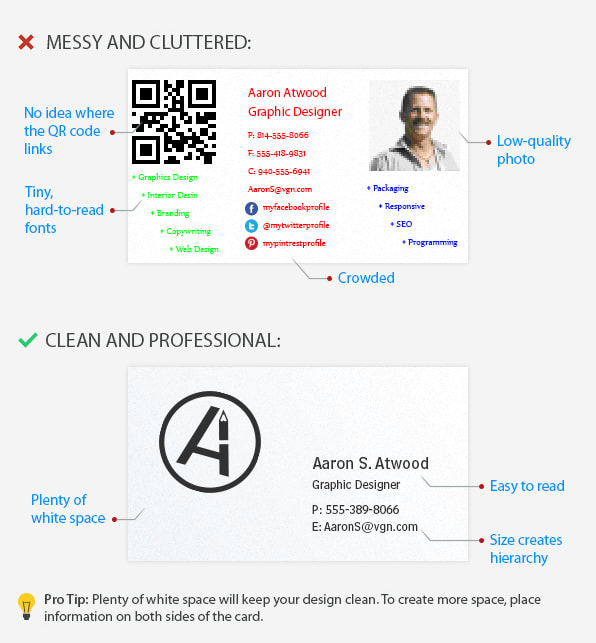 1. A business card cluttered with information may make a negative impression on its recipient. Vast blank spaces make your design look neat and clean.