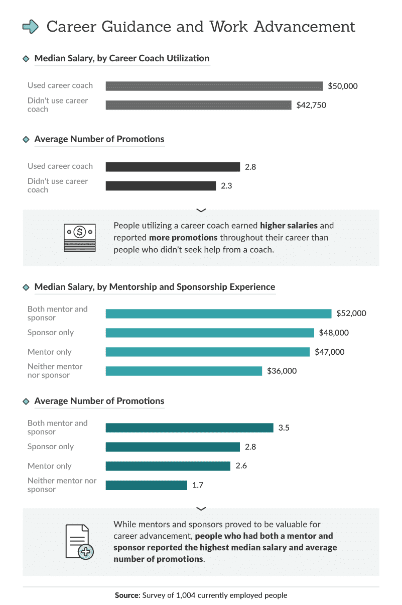 In tangible terms, how might career coaching, mentoring, or sponsorship translate to better pay or promotions? Among professionals who hired a career coach, the median annual salary was $50,000, which is $7,250 more than that of people who hadn’t. This statistic could demonstrate that career coaches are well worth their fees – or that only high-earning professionals can afford their services. Additionally, those who utilized career coaches were promoted slightly more often, on average.